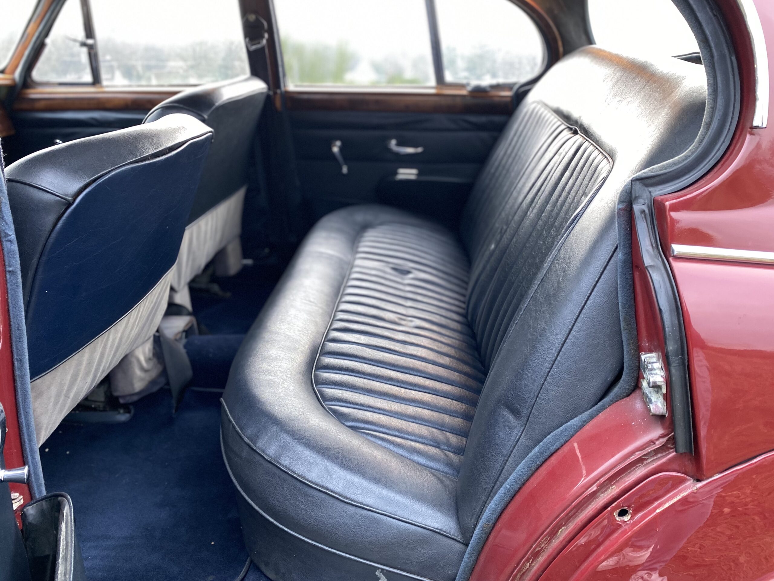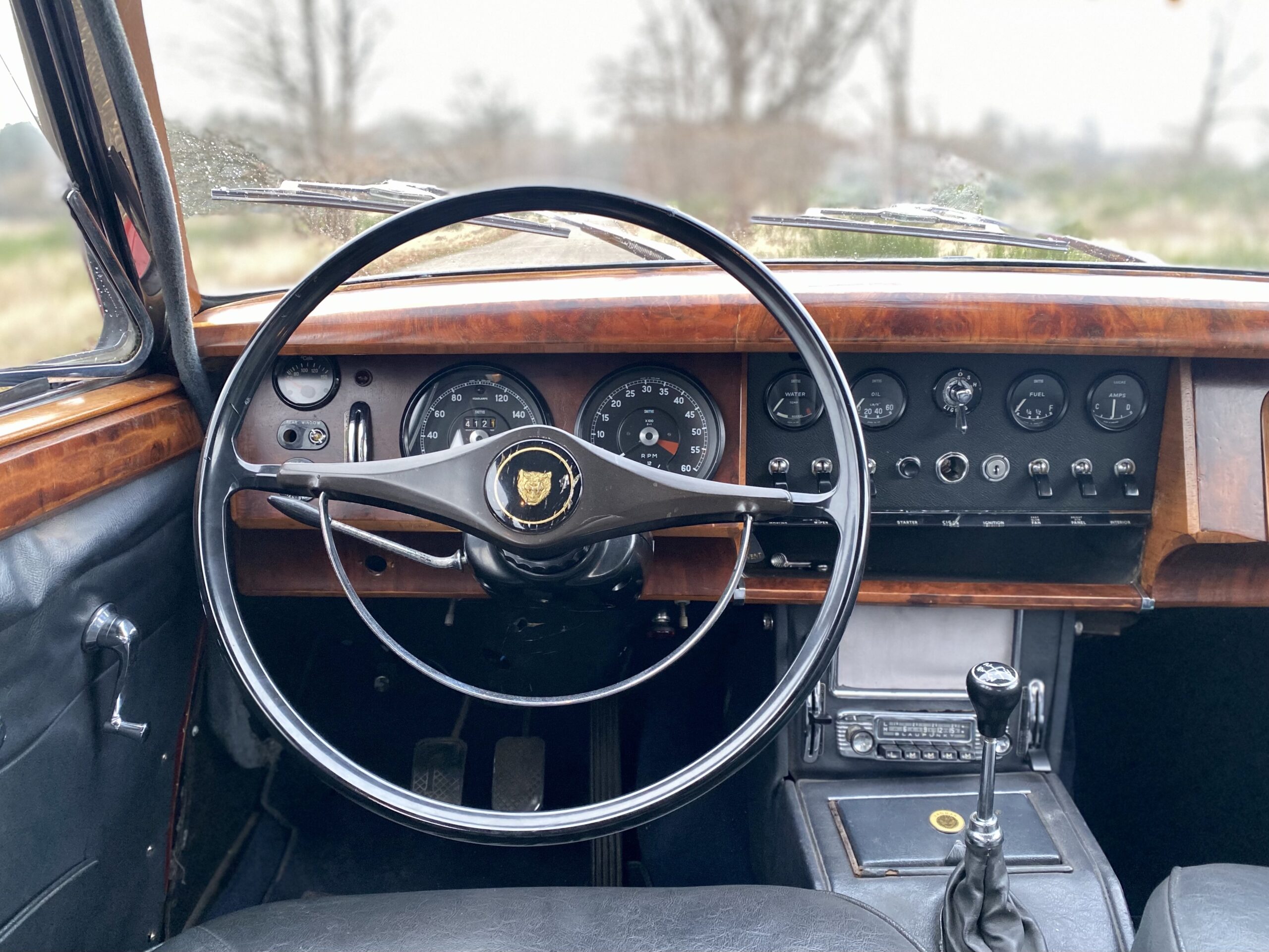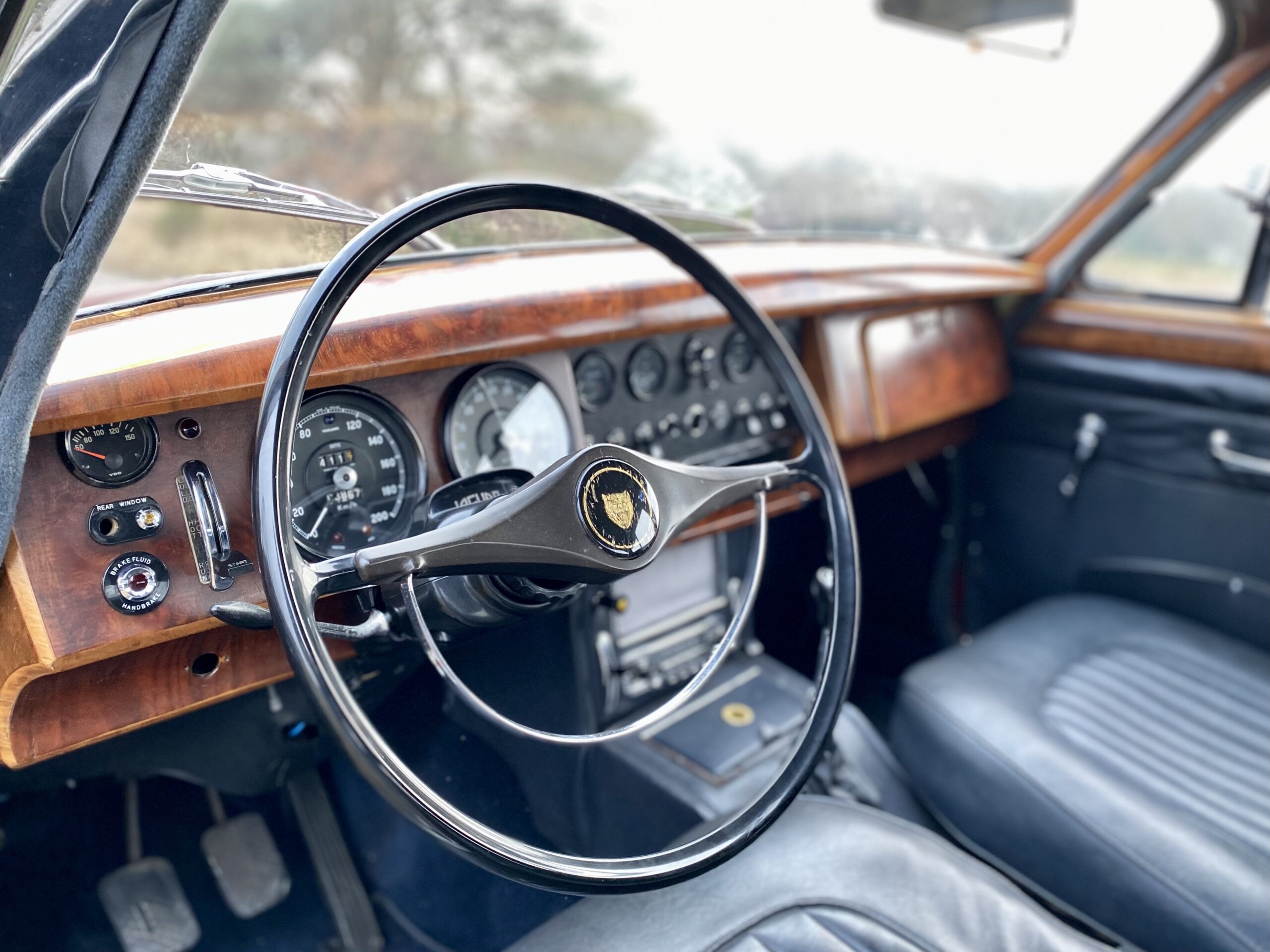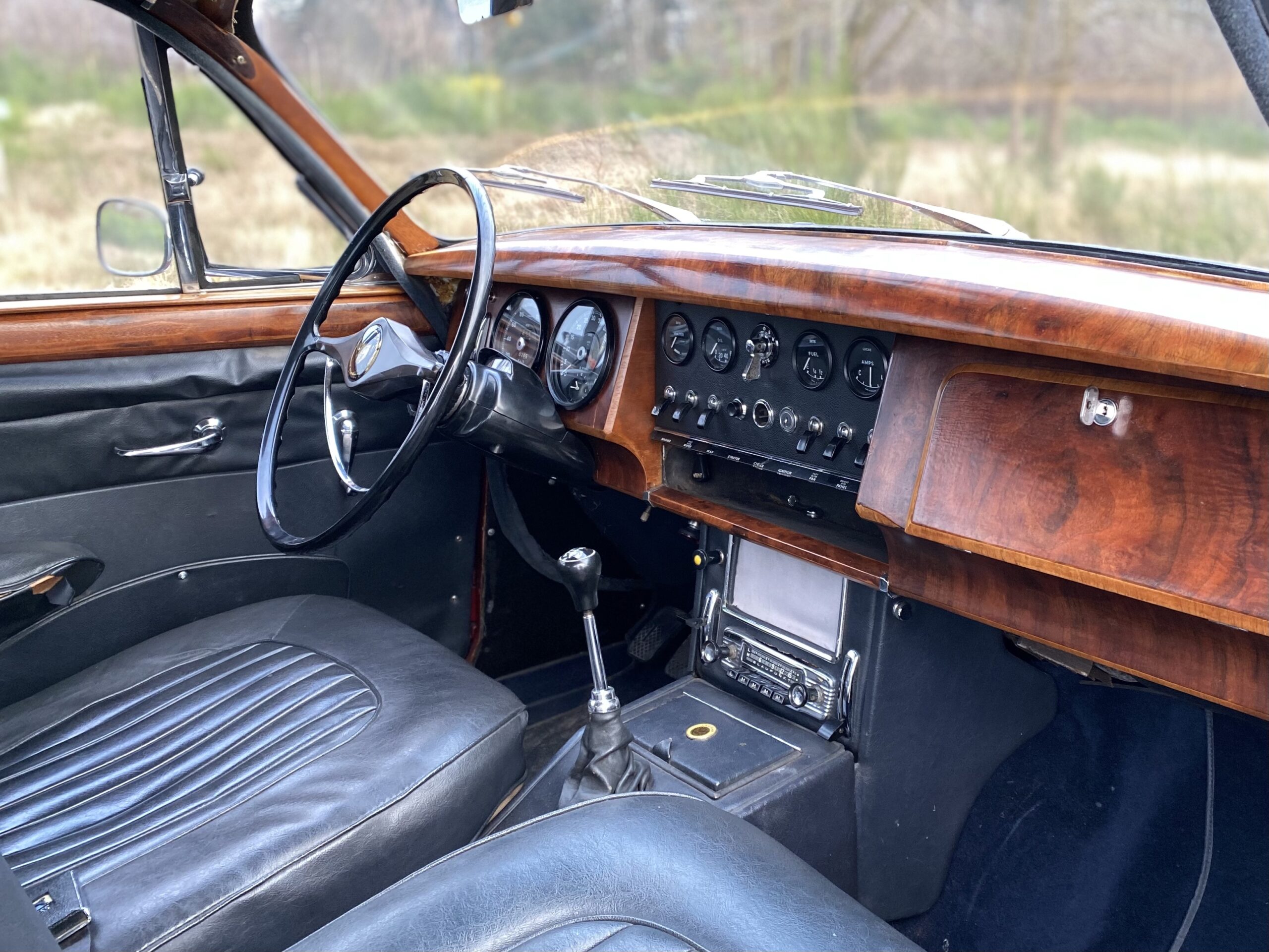 Het interieur is in een gebruikte conditie. Het houtwerk is wat dof, maar zonder beschadigingen. Al met al een erg fijne Jaguar 240 die klaar is voor de volgende eigenaar voor vele plezierritten of rally’s.